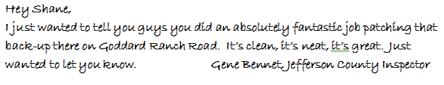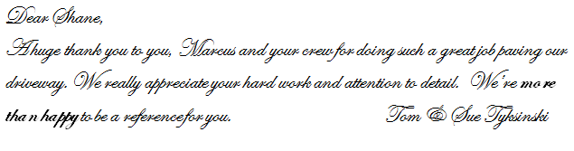 Thanks Shane for replacing our driveway! It looks great and we’ve received many compliments. How you re-shaped it and adding the “hammer head” for the turn around is perfect. Of course as I run into people needing asphalt I’m referring them to you! Shawn and Kelly