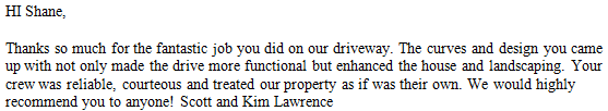 Thanks so much for the fantastic job you did on our driveway. The curves and design you came up with not only made the drive more functional but enhanced the house and landscaping. Your crew was reliable, courteous and treated our property as if was their own. We would highly recommend you to anyone! Scott and Kim Lawrence